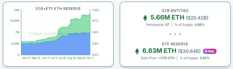 StrategicETHReserveのデータによると、67社のトレジャリー企業が約566万ETH、現物ETFが約683万ETHを保有しており、合計で約1,249万ETHに達したところだ。