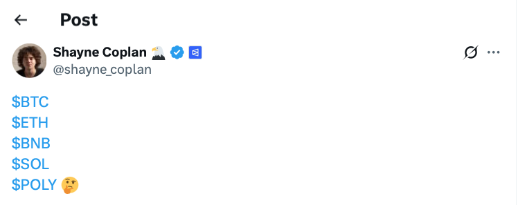 投稿では、時価総額上位のビットコイン、イーサリアム、BNB、ソラナの次に、「POLY」トークンが並べられている。ポリマーケットはネイティブトークンを発行していないため、新たなトークン発行を示唆したものではないかとの憶測が広がっている。