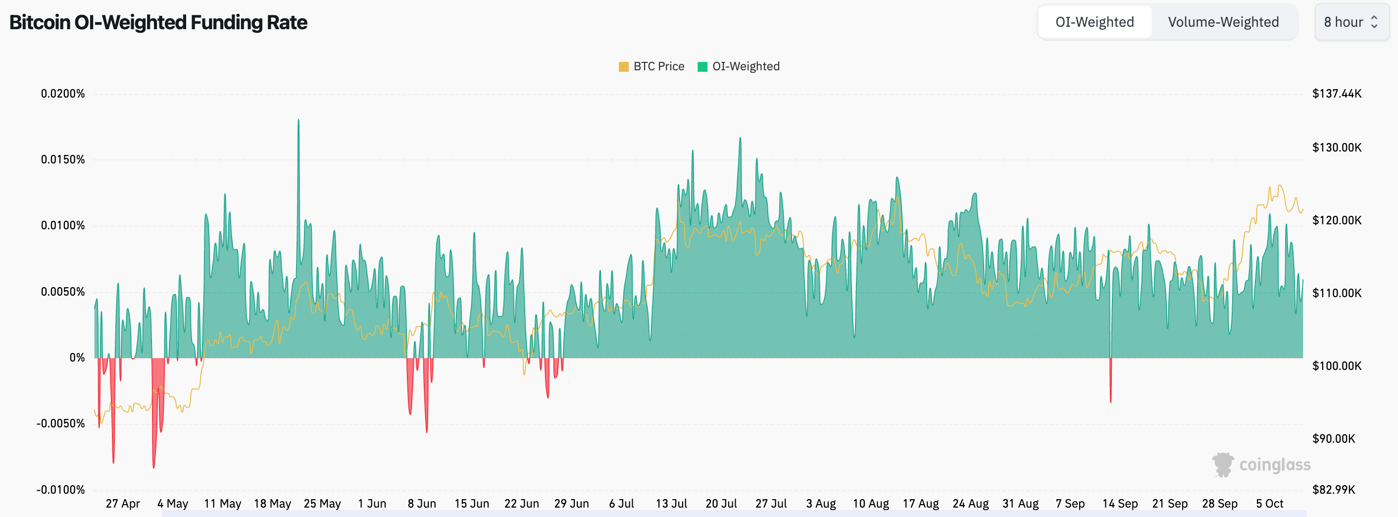 Coinglassによれば、9日時点でビットコインのOI(未決済建玉)資金調達率はプラス圏を維持しており、ロングポジションが依然として市場を支配していることを示している。