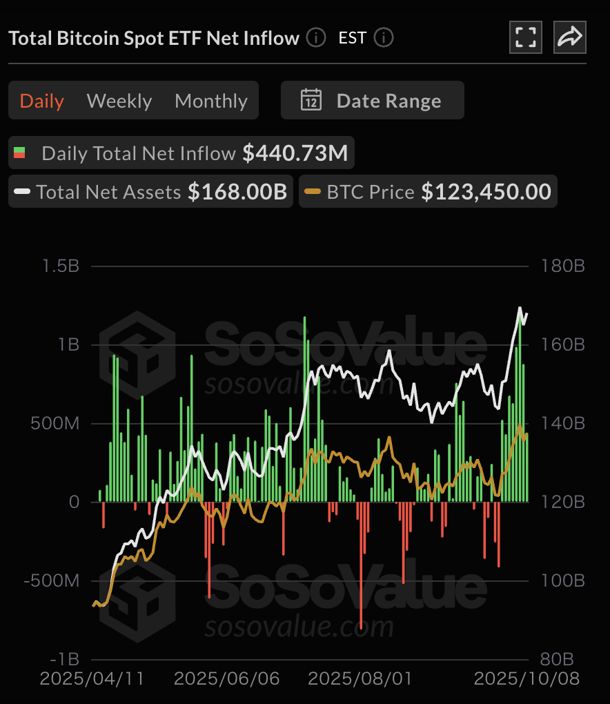 さらに、機関投資家からの需要は堅調だ。SosoValueのデータによると、ビットコイン現物ETFには8日連続で資金が流入しており、時折のボラティリティ上昇にもかかわらず市場の信頼感は安定している。