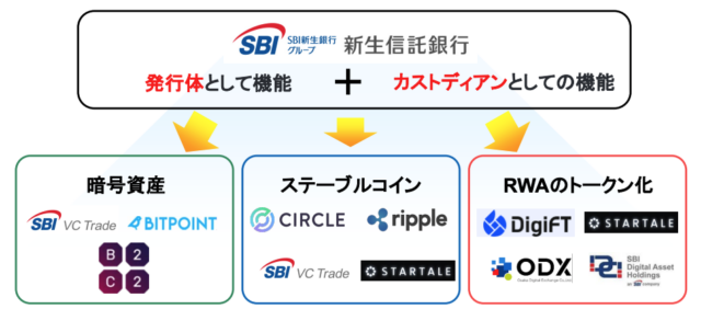 信託銀行の活用:日本では海外発行ステーブルコインに100万円の移転上限規制が存在します。この制約を回避するため、SBIグループは新生信託銀行をステーブルコイン発行体およびカストディアン(保管機関)として活用し、取引額制限を受けずに暗号資産やRWAトークンの保管・決済サービスを提供できる体制を整えています。
