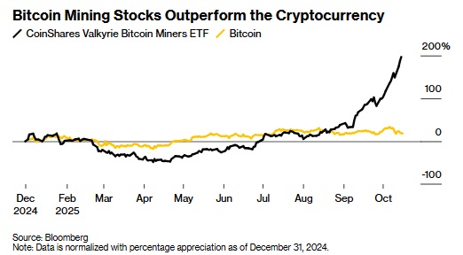 暗号資産(仮想通貨)マイニング企業の株価は、2025年初来でビットコイン(BTC)を上回るパフォーマンスを発揮している。ブルームバーグが18日の報道で指摘した。