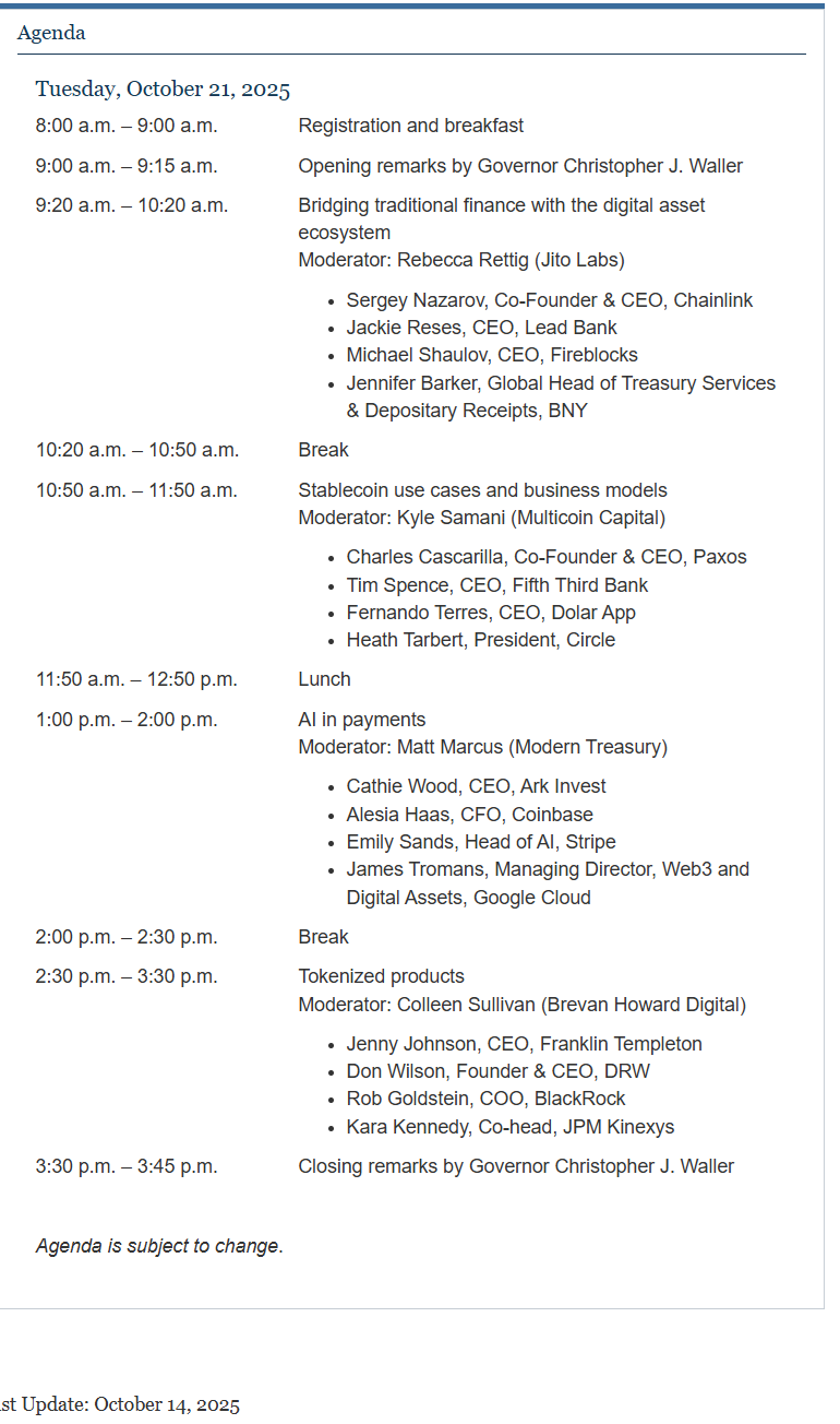 なお、FRBは9月3日付の発表で本会議の開催を予告しており、今回の公表はその詳細版にあたる。暗号資産やデジタル決済を巡る政策議論が進むなか、中央銀行が主催する形での官民対話に注目が集まっている。
