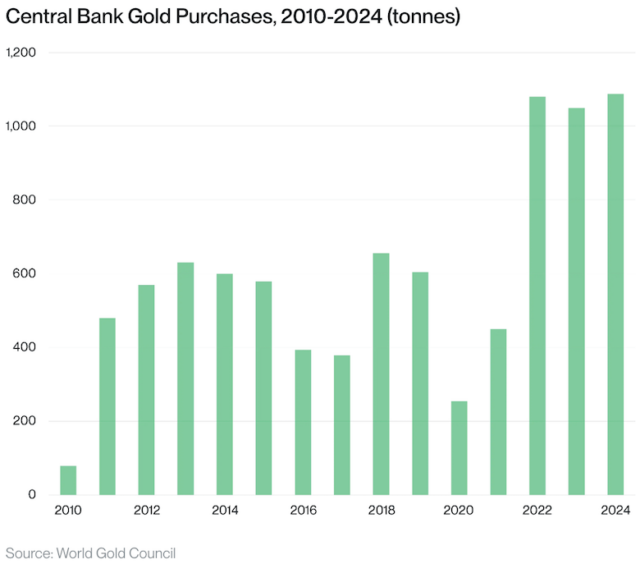 この売り圧力を特定するために引用したのもゴールドの値動き。以下のグラフを引用し、中銀によるゴールドの購入は2022年から増え、その後は同水準である一方で、価格は2025年まで高騰はしなかったと指摘した。