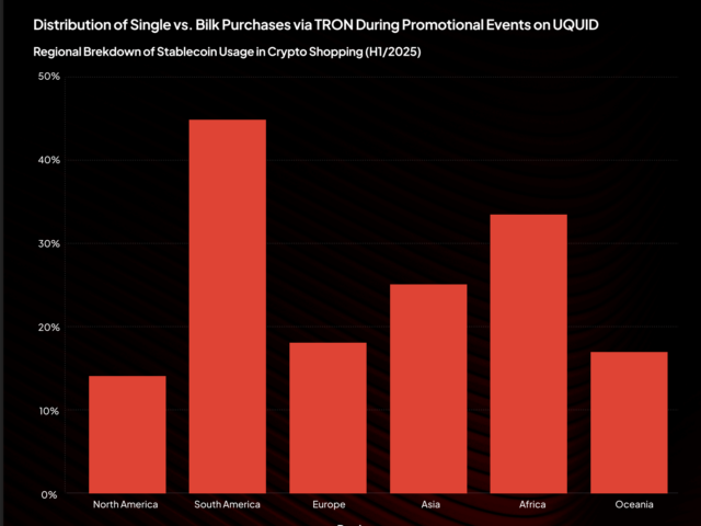 暗号資産決済プラットフォームUQUIDの2025年上半期データによると、同プラットフォーム内のステーブルコイン決済において、地域別でトロンチェーンが使われた割合は以下の通りだ: