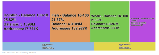 CryptoQuantは、ドルフィンは保有残高100~1,000BTCのアドレスだとしている。このグループが、現在ビットコインのシェアで最大であり、供給量の26%である約516万BTCを保有しているところだ。
