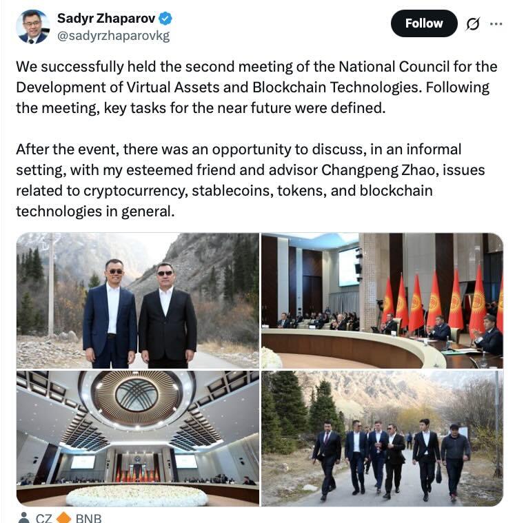 この発表は、首都ビシュケクで開催された仮想資産・ブロックチェーン技術開発国家評議会の第2回会合の際に行われたもので、同会合には大手暗号資産(仮想通貨)プラットフォーム、バイナンス創設者のチャンポン・ジャオ(CZ)氏が出席した。