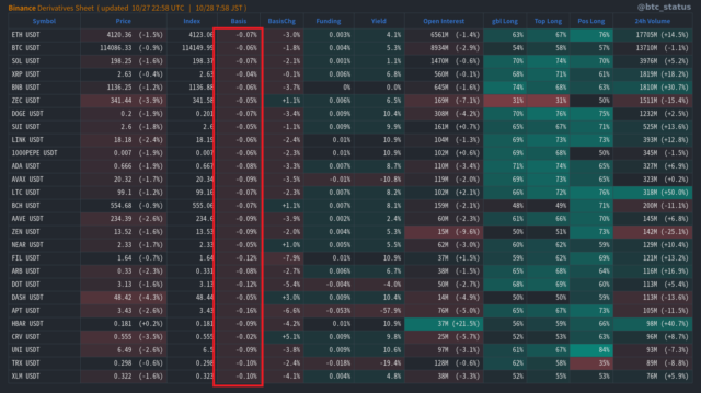 仮想通貨全体では主要アルトコインの先物価格が現物を下回る水準で推移しており、全体的に売られすぎの状況が生じている。