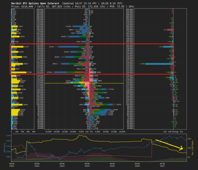 オプション市場においては、コールポジションが大きく増加している(下画像赤枠)。プットコールレシオ(PCR)は低下傾向にあり(下画像黄矢印)、市場参加者が強気姿勢へと転じつつあることを示唆している。特に12万ドル台や14万ドルといった現値を上回る水準のコール建玉が増加しており、市場の目線が明確に上方向へ移行していることが読み取れる。