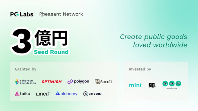 Ethereum(イーサリアム)とLayer 2を活用したWeb3事業の企画・開発支援、およびPheasant Networkの開発にコミットする「株式会社PGL(本社:東京都渋谷区、代表:田上智裕)、以下:PG Labs」は、国内外のベンチャーキャピタルおよび個人投資家を引受先とする総額3億円のシードラウンド資金調達(グラント含む)を実施しました。