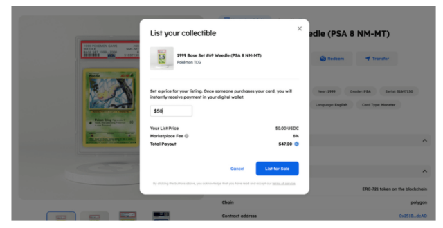 実物カードは高セキュリティ金庫で保険付き管理され、対応するNFTが発行されます。物理的な輸送なしに世界中で瞬時に取引でき、いつでも実物カードとの交換(償還)も可能です。