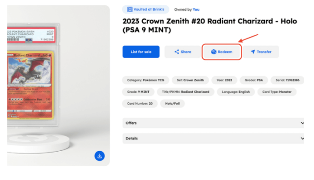 所有するNFTカードの詳細ページを開くと、横に「Redemption(引き換え)」ボタンが表示されます。このボタンから引き換えリクエストを送信すると、本人確認(KYC)と、送料・関税などの支払い手続きが案内されます。