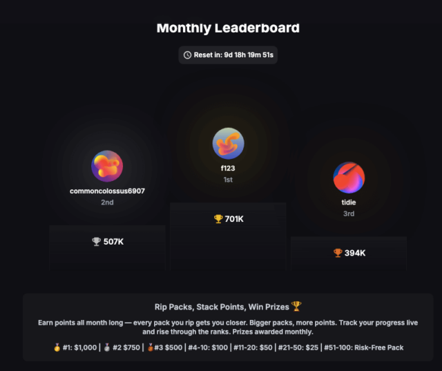 リーダーボードには、ポイント獲得数や活動状況に応じてユーザーの順位が表示されます。日々の開封や取引を重ねることで上位を目指せるため、コレクション体験に競争性と達成感が加わります。