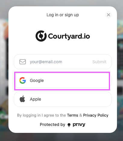 CourtYardを利用するには、まず公式サイトでアカウントを作成し、ウォレットを接続します。 Googleアカウントがあれば、数分で完了します。