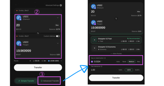 ③「Advanced Transfer」を選択し、Gas on destination を「Medium」に設定します。(※国内取引所でPOLを準備していない場合)