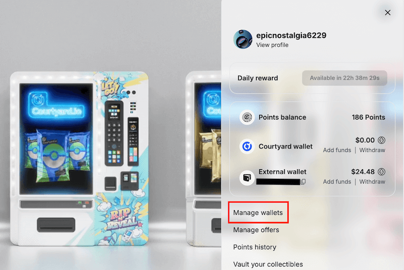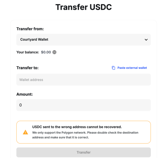 CourtYardでカードを売却すると、USDCは初期設定では「CourtYard Wallet」に入金されます。MetaMaskなど接続したウォレットには自動的に送られないため、手動で出金手続きが必要です。