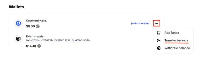 ②「Wallets」からCourtYard Walletの「⋯」をクリックし、「Transfer Balance」を選択。