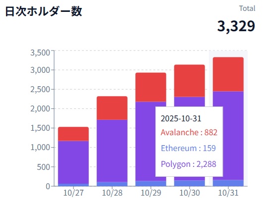JPYC Infoによると、発行後から現在までの1週間弱で、JPYCの発行量は約8,900万円相当に到達。日次ホルダー数は3,329に達した。JPYCは現在、ポリゴン(POL)、イーサリアム(ETH)、アバランチ(AVAX)のチェーンで提供されている。