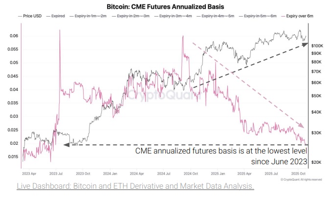 この状況は、6か月以上先に満期となるビットコイン先物を保有する需要がここ数か月よりも低下していること、ビットコインの現物価格が8万ドルから12万ドルに上昇するにつれて先物への需要が減少したことを示している。記事執筆時点ではビットコインは10万9,900ドル付近で推移している。