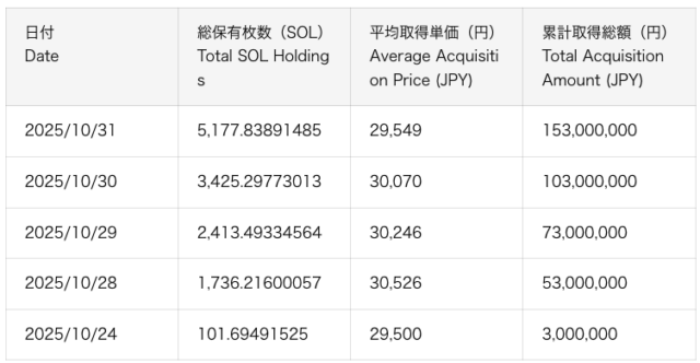 モブキャストHDは10月24日から暗号資産ソラナ(SOL)の取得を開始し、31日までに累計約5,177SOL(取得総額約1億5,300万円、平均取得単価29,549円)を保有した。