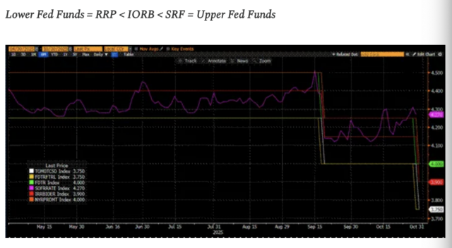 ヘイズ氏は、SRF残高がゼロを上回っている場合、FRBが新たに(デジタルで)印刷したマネーで政府の資金調達を間接的に支えていることを意味すると説明した。国債発行額の増加はドル供給の増加と等しく、これは実質的な量的緩和だと主張した。FRBは量的緩和という言葉を避けるため、銀行準備預金を創出する従来型の資産購入ではなく、SRFを通じた資金供給を選択するとの見方を示した。
