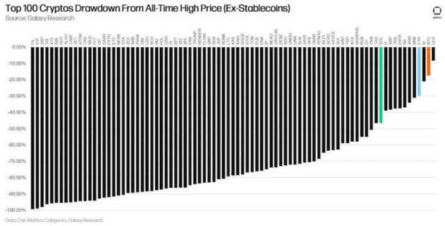 暗号資産(仮想通貨)関連企業ギャラクシーのリサーチ部門「Galaxy Research」は6日、時価総額トップ100の仮想通貨の内72銘柄の価格が、過去最高値から50%以上下落していると報告した(ステーブルコイン除く)。