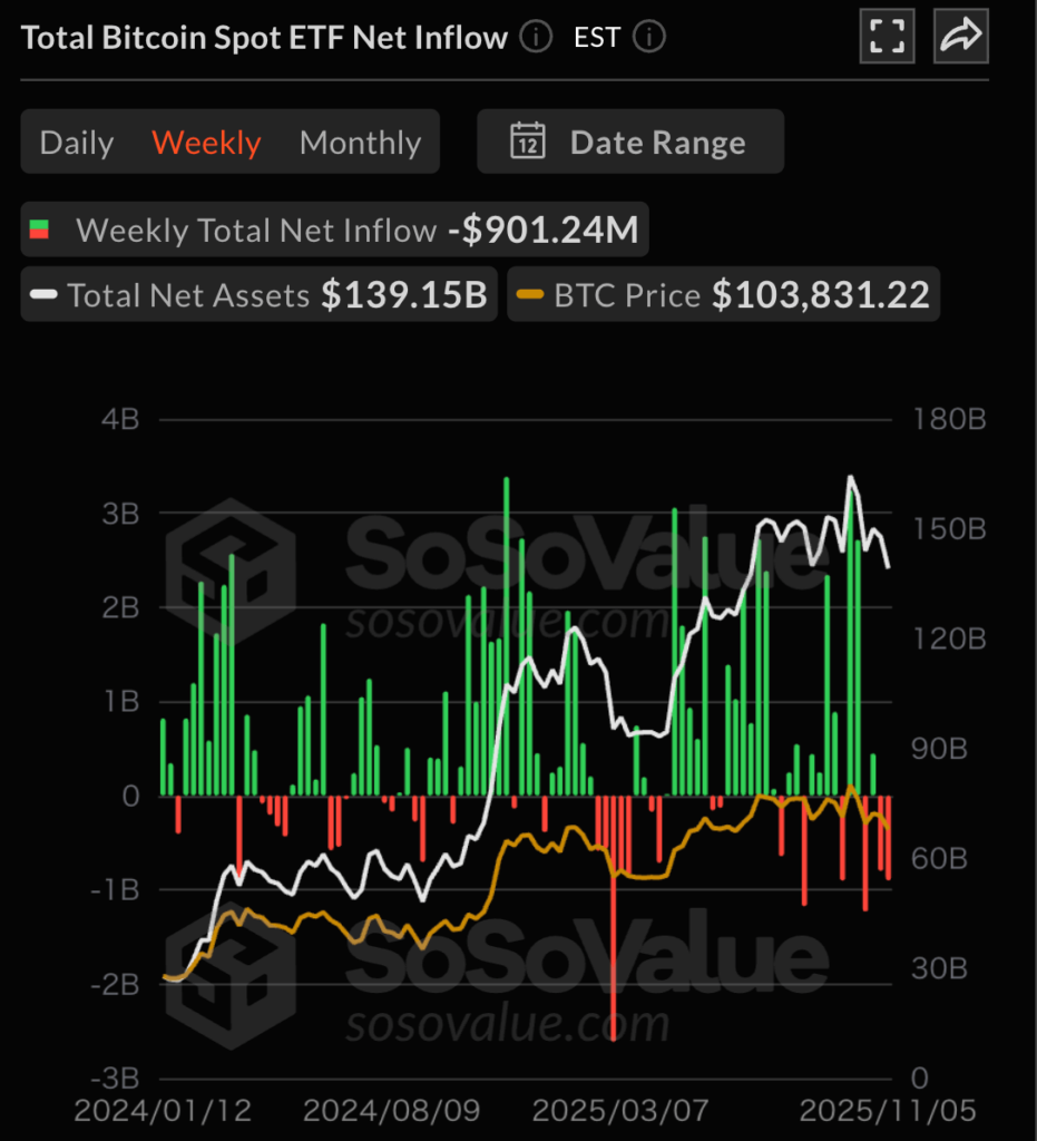 機関投資家によるビットコイン現物ETF(上場投資信託)への資金も流出傾向にあり、過去1週間で9億ドルの純流出が発生した。