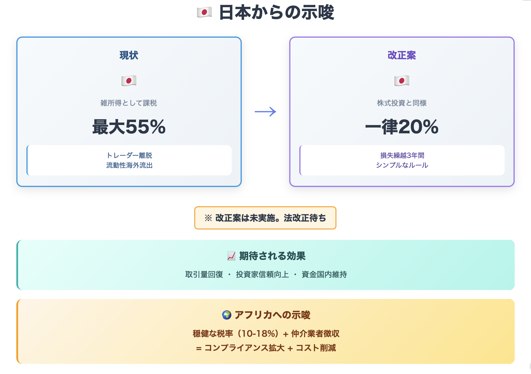 アフリカ諸国の税制設計を理解する上で、日本の経験は重要な示唆を与える。日本は改革のグローバルなベンチマークを提供している。長年、日本は仮想通貨の利益を雑所得として課税し、合計税率は55%近くに達していた。この高い負担はトレーダーを落胆させ、流動性を海外に流出させた。