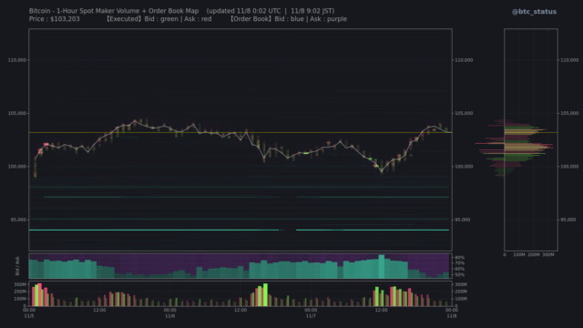 オーダーブック(板情報)を分析すると、現値より上にも下にも厚い板が存在しない状態にあり、流動性の薄さからボラティリティは高まりやすい環境にあるといえる。