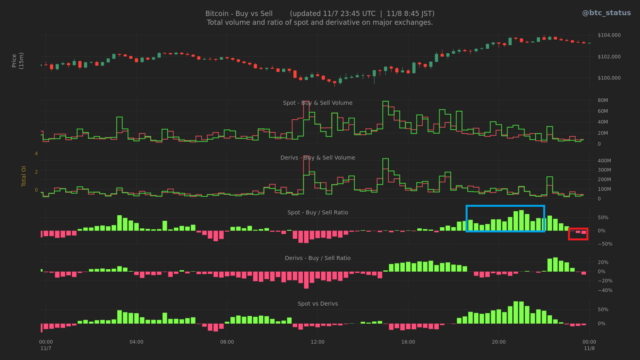 成行注文の動向をみると、節目である10万ドルを割り込んだ直後に、現物の買いを中心とした上昇が確認された(下画像青枠)。これはショートカバー(売り方の買い戻し)による動きに加え、ステーブルコインへの信用不安を背景に、一時的にビットコインなど暗号資産への退避が進んだことが要因と考えられる。ただし、CMEの取引時間終了後は再び売りが先行し、上値の重い展開となっている(下画像赤枠)。