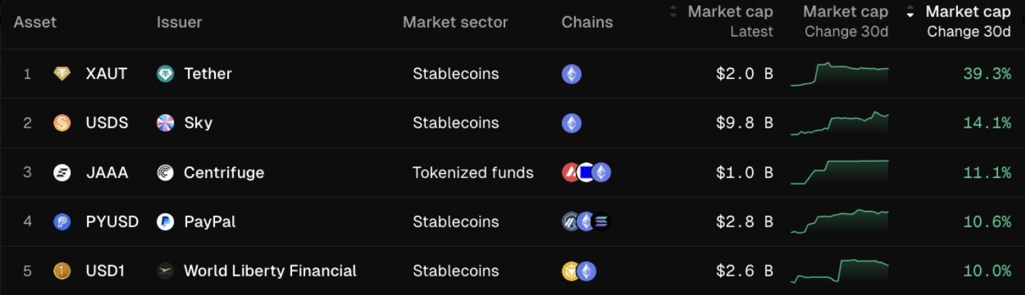 なお、成長率2位はスカイプロトコルの米ドル建てステーブルコインUSDS、3位はCentrifugeによるトークン化ローン担保証券JAAA、4位はペイパルの米ドル建てステーブルコインPYUSD、5位はワールドリバティフィナンシャルの米ドル建てステーブルコインUSD1となっている。