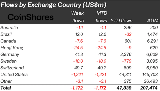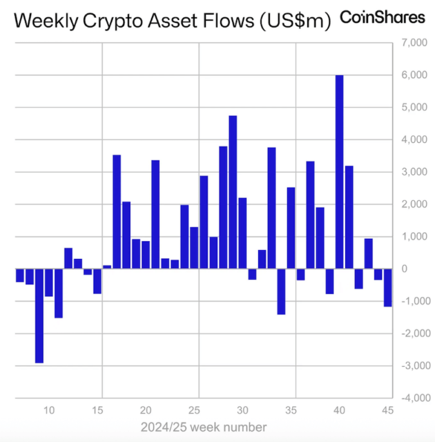 暗号資産(仮想通貨)投資企業CoinSharesでリサーチ部門のトップを務めるジェームズ・バターフィル氏は10日、ETFなどのデジタル資産投資商品全体への先週における資金フローは、約11.7億ドル(約1,800億円)の純流出だったと報告した。