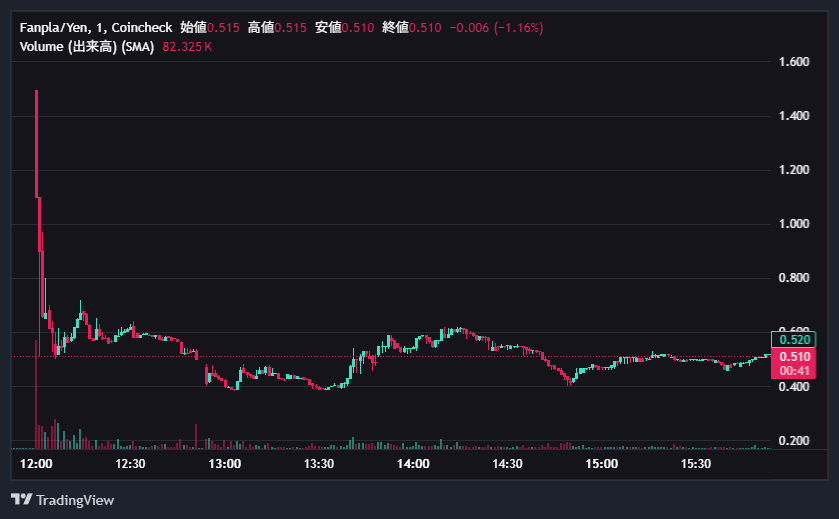 公開直後から売りが殺到し、取引開始1分で0.510円(公募価格比-49%)まで急落。IEO特有の「当選売り」圧力や市場全体の暗号資産低迷が影響した可能性がある。次の1分足で一時0.8円付近まで反発したが伸びず、午後は小幅推移が続いた。16時時点では0.51円前後で推移している。