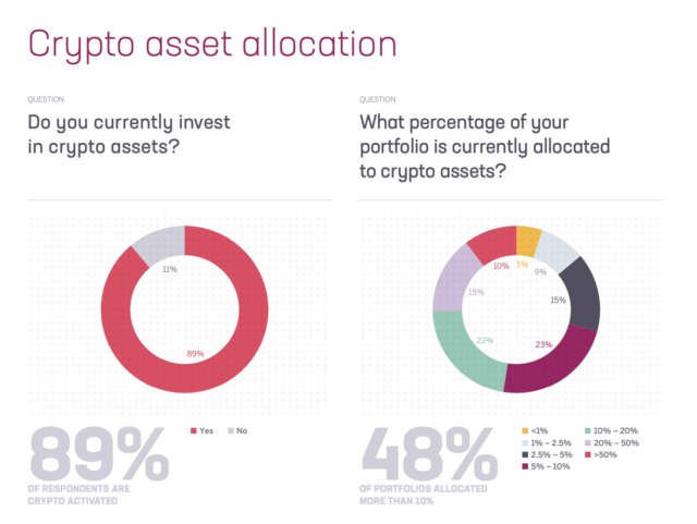 回答者の89%はすでに仮想通貨に投資しており、48%の回答者がポートフォリオの10%以上を仮想通貨に配分している。このうち、ポートフォリオの50%超を配分しているのは23%、20〜50%を配分しているのは15%だった。