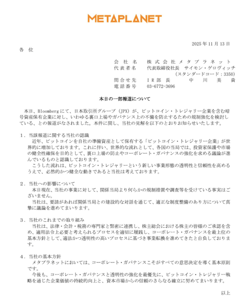 なお、同社は日本取引所グループ(JPX)がビットコイン・トレジャリー企業を含む暗号資産保有企業に対して、コーポレートガバナンスの強化などの規制強化を検討している可能性があるとの一部報道についてもコメントを発表した。