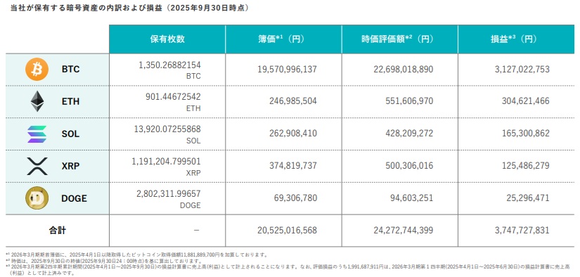 リミックスポイントは9月30日時点で、時価評価額約227億円相当のビットコイン(BTC)、約5.5億円相当のイーサリアム(ETH)、約4.3億円相当のソラナ(SOL)、約5億円相当のXRP、約9,500万円相当のドージコイン(DOGE)を保有している。
