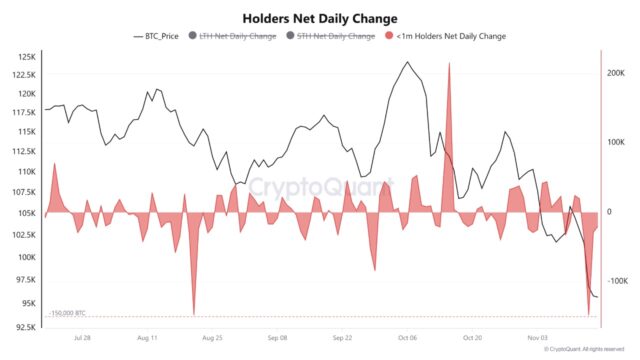 一方で、クリプトクアントの登録アナリスト、クレイジーブロックは16日、新規投資家による大規模なパニック売りを報告した。100万BTC未満を保有する投資家が14万8,241BTCを約9万6,853ドルで売却していた。これは平均購入価格10万2,000ドルから10万7,000ドルをはるかに下回る水準で、大規模な損切りとなった。同氏は、これらの投資家が初めての大きな下落に直面し、さらなる下落リスクを回避するため損失を確定させることを選択したと分析した。