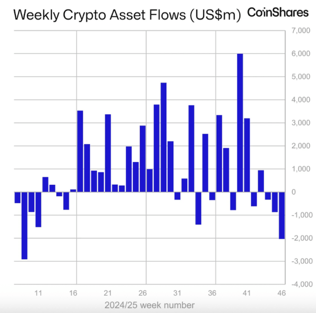 暗号資産(仮想通貨)投資企業CoinSharesでリサーチ部門のトップを務めるジェームズ・バターフィル氏は17日、ETFなどのデジタル資産投資商品全体の先週における資金フローは、20億ドル(約3,100億円)超の純流出だったと報告した。