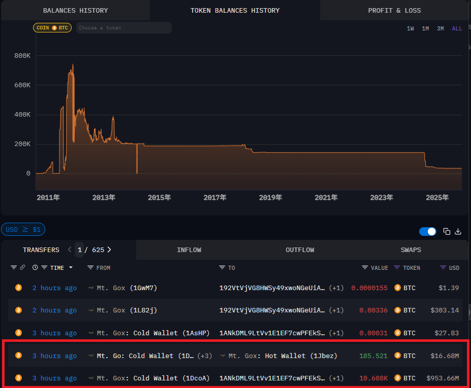 ブロックチェーン分析企業アーカム・インテリジェンス(Arkham Intelligence)のデータによると、18日午後(日本時間)、同社管財人が管理するとみられるコールドウォレットから約1万BTCが同社ホットウォレットに送金された。その後、約1万422BTCが未確認アドレス「1ANkD…ojwyt」へ、残りの約185.5BTCがホットウォレット内で移動された。