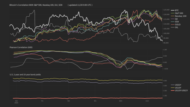 他の主要アセットとの相関関係(直近2カ月)をみると、Nasdaq100が-0.19、半導体指数(SOX)が-0.27、金が-0.33と、リスク資産・安全資産のいずれに対しても弱い逆相関の状態が続いている。ビットコイン単独の需給悪化が価格形成に影響している構造である。