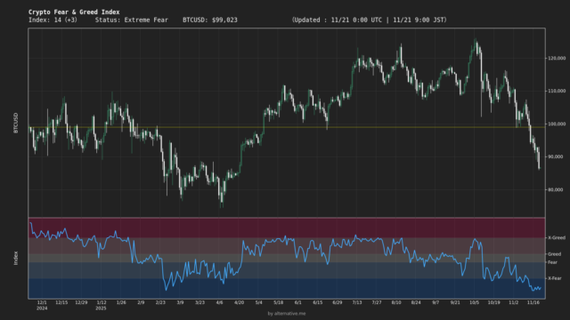 Fear & Greed Indexにおいても今年の最低水準に低下しており、市場心理は著しく悪化している。