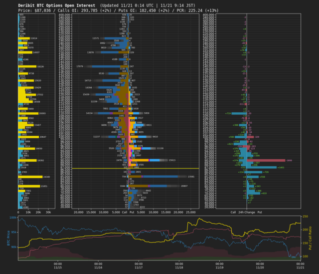 オプション市場では、プットコールレシオ(PCR)が顕著に上昇しており、市場参加者が極めて弱気なポジションを構築していることが読み取れる。