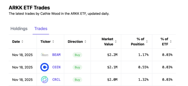 同日の取引開示によると、ARKイノベーションETF(ARKK)とARKフィンテック・イノベーションETF(ARKF)は、コインベース・グローバル株を合計300万ドル(約4億5,000万円)相当、サークル・インターネット・グループ株を310万ドル(約4億6,500万円)相当購入した。また、ARKFはブリッシュ株も110万ドル(約1億6,500万円)相当取得している。