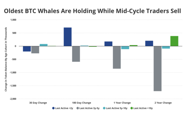 一方、5年以上保有されているビットコインは2年前と比べて27万8,000BTC純増した。これは保有期間の短いコインが5年超のカテゴリーに移行したことを反映しているが、長期大口保有者の確信が続いていることを示している。