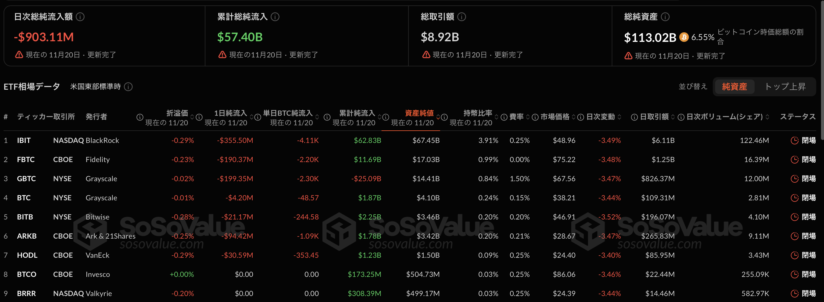 11月20日(米東部時間)、米国ビットコイン現物ETF(上場投資信託)市場は合計9億300万ドル(約1,395億円)の純流出を記録し、史上2番目の規模となった。