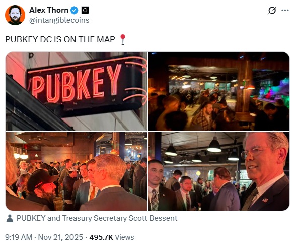 米国のスコット・ベセント財務長官は20日、暗号資産(仮想通貨)ビットコイン(BTC)をテーマにしたバー「Pubkey DC」のグランドオープンに予告なく立ち寄った。このことが仮想通貨コミュニティで話題になっている。