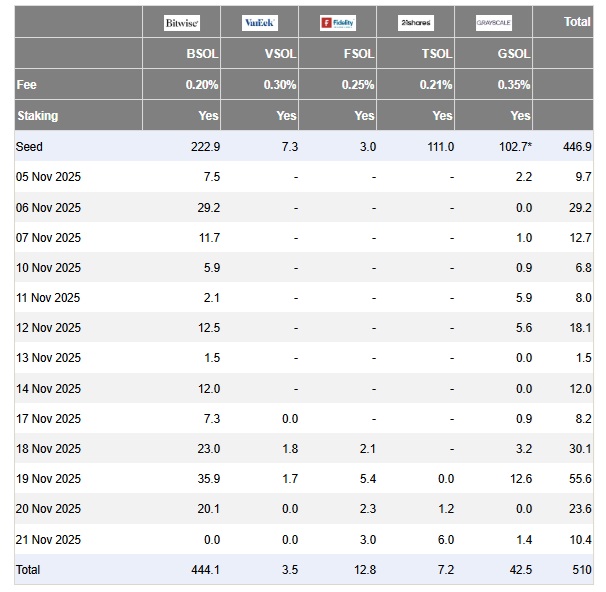 Farside Investorsによると、21日までに約5.1億ドル(約800億円)が流入。これらのETFはいずれも、保有ソラナのステーキングも行っている。
