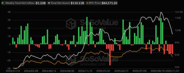 米国に上場している暗号資産(仮想通貨)ビットコイン(BTC)の現物ETFは、21日までの1週間の資金フローが合計12.2億ドル(約1,914億円)の純流出だった。