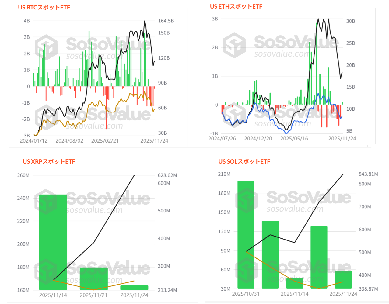 SOL ETF(右下):+1.28億ドル XRP ETF(左下):+1.79億ドル