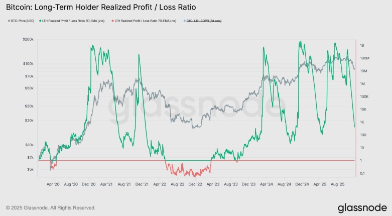 Glassnodeによると、オンチェーンデータはストレスの高まりを示している。短期保有者の実現利益と実現損失を比較したSTH実現損益比率を見ると、10月初旬に中立的な平均値(4.3倍)を下回り、現在は0.07倍まで低下している。